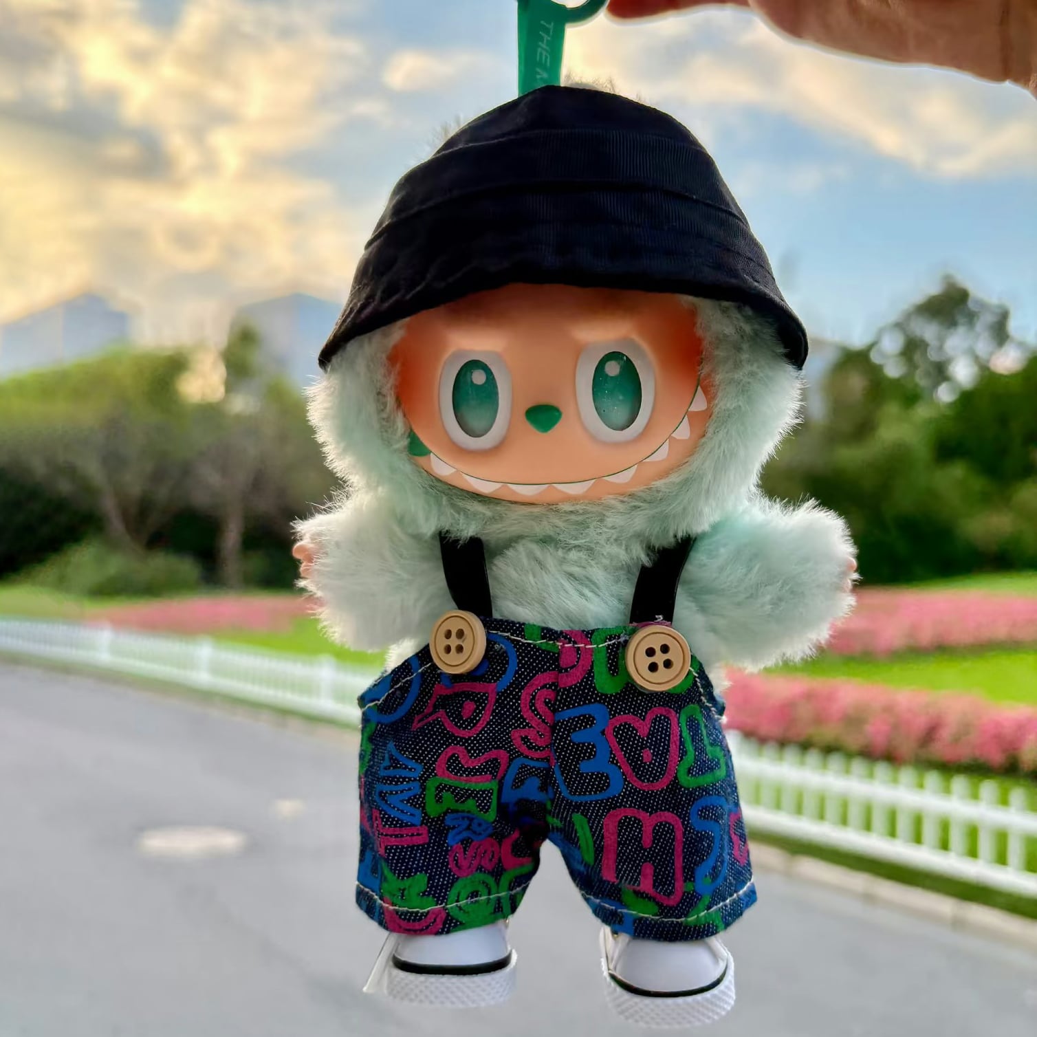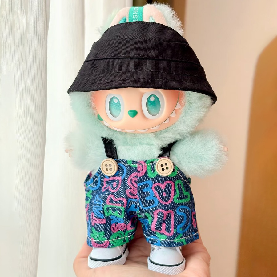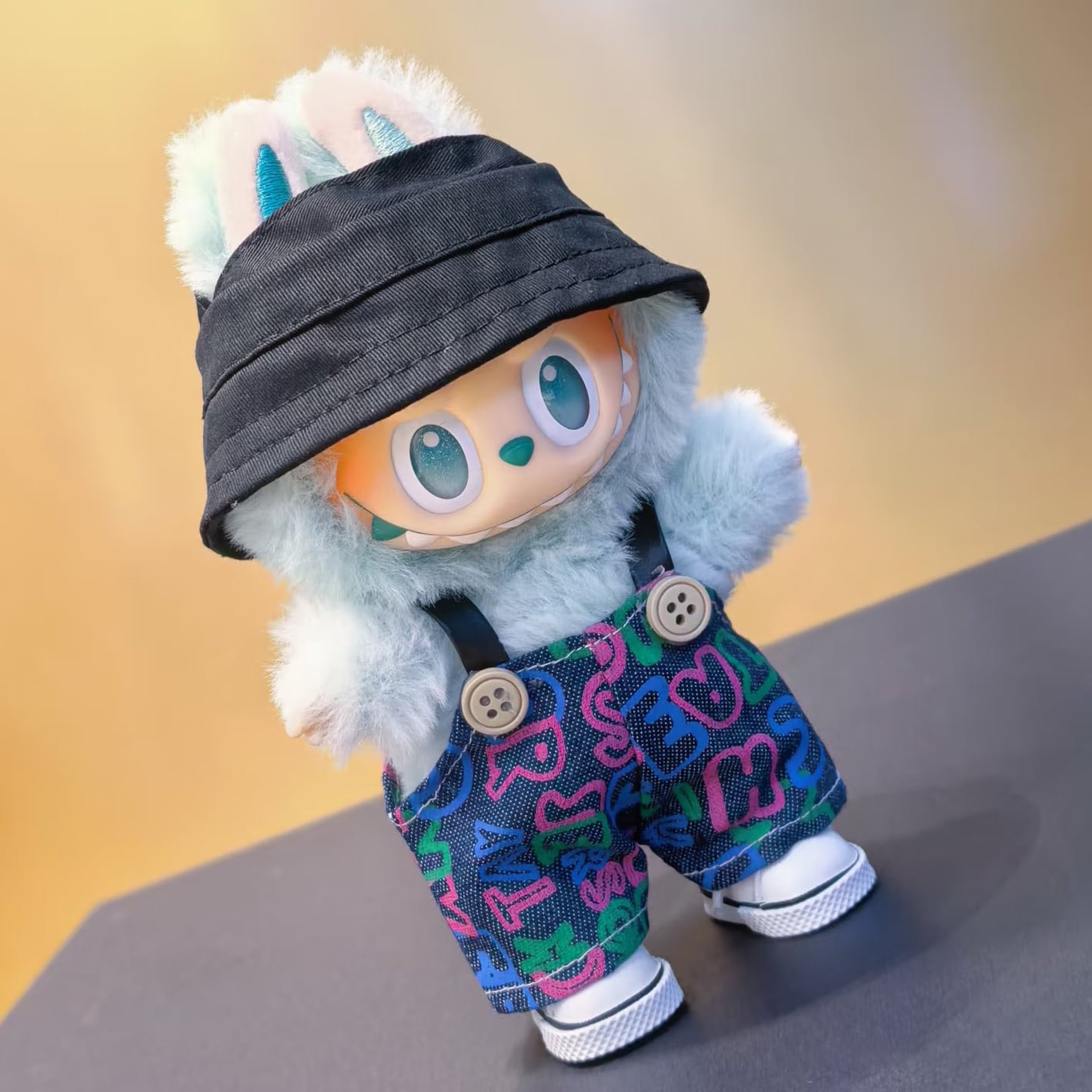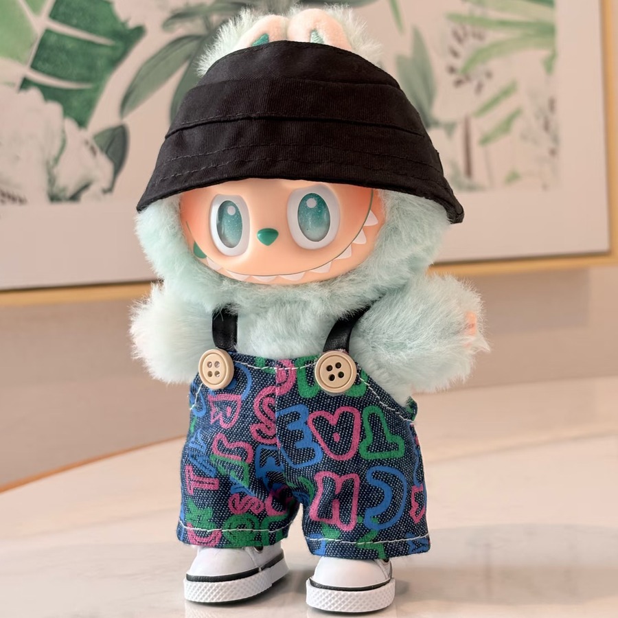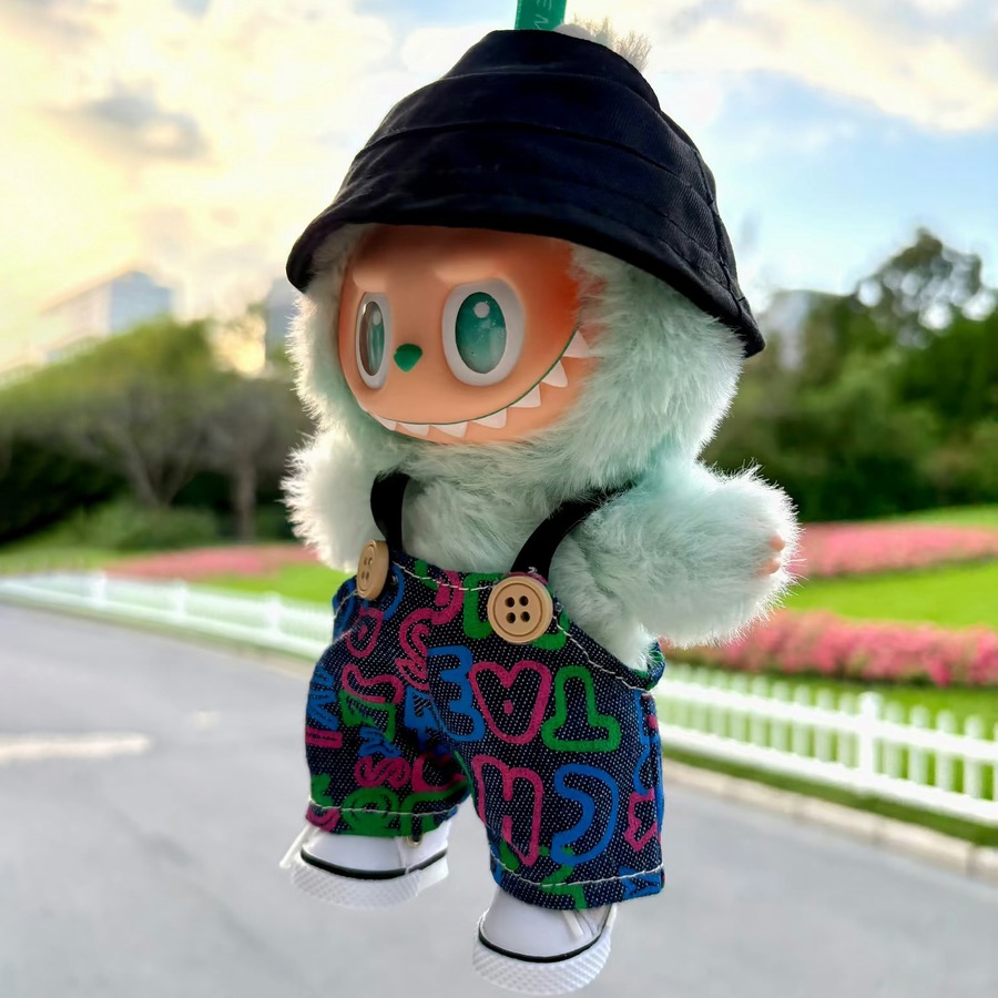 グラフィティデザインがおしゃれ!ラブブ LABUBUコーデ 17cm ストリート爽やか3点セット 帽子×サスペンダー×シューズ かわいい&高品質