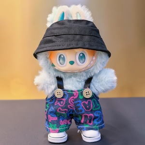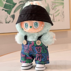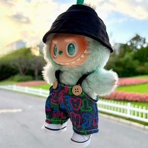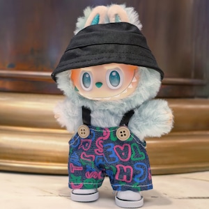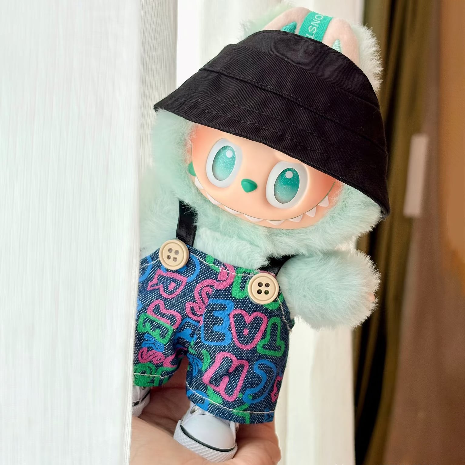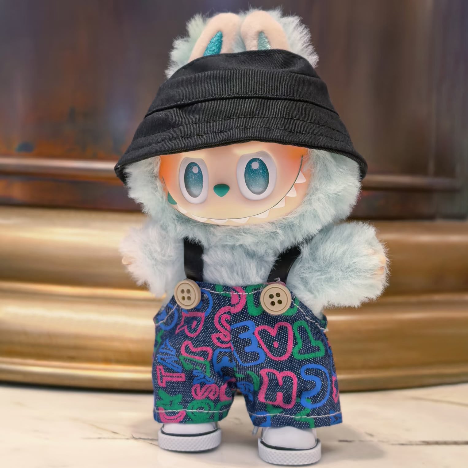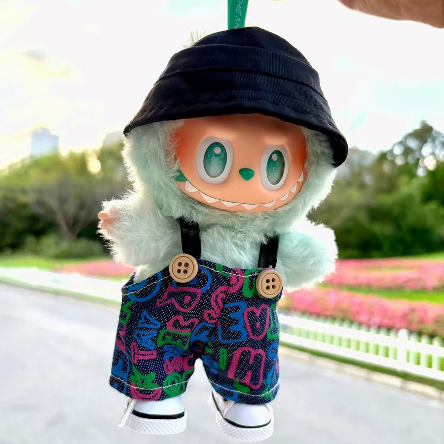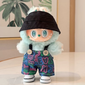 グラフィティデザインがおしゃれ!ラブブ LABUBUコーデ 17cm ストリート爽やか3点セット 帽子×サスペンダー×シューズ かわいい&高品質
